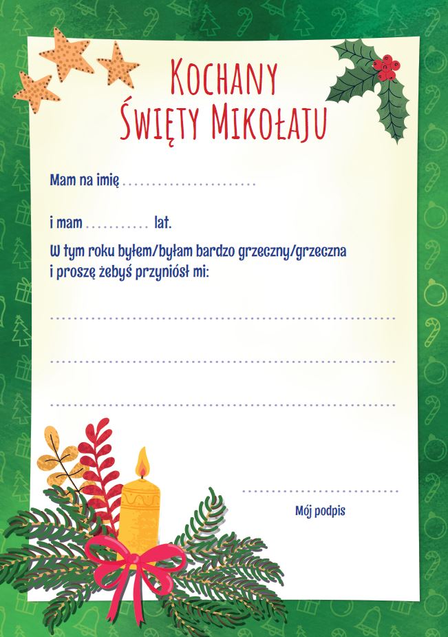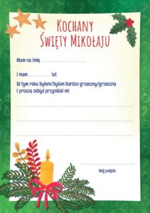 Specjalny list do Świętego Mikołaja, który każde dziecko może uzupełnić o swoje dane, a przede wszystkim może skierować prośbę o wymarzone prezenty. List ten posiada adres do Świętego Mikołaja wraz ze znaczkiem i magicznym stemplem zapewniającym, że list dotrze błyskawicznie do adresata. Nie zwlekaj i zdobądź ten list jak najszybciej.