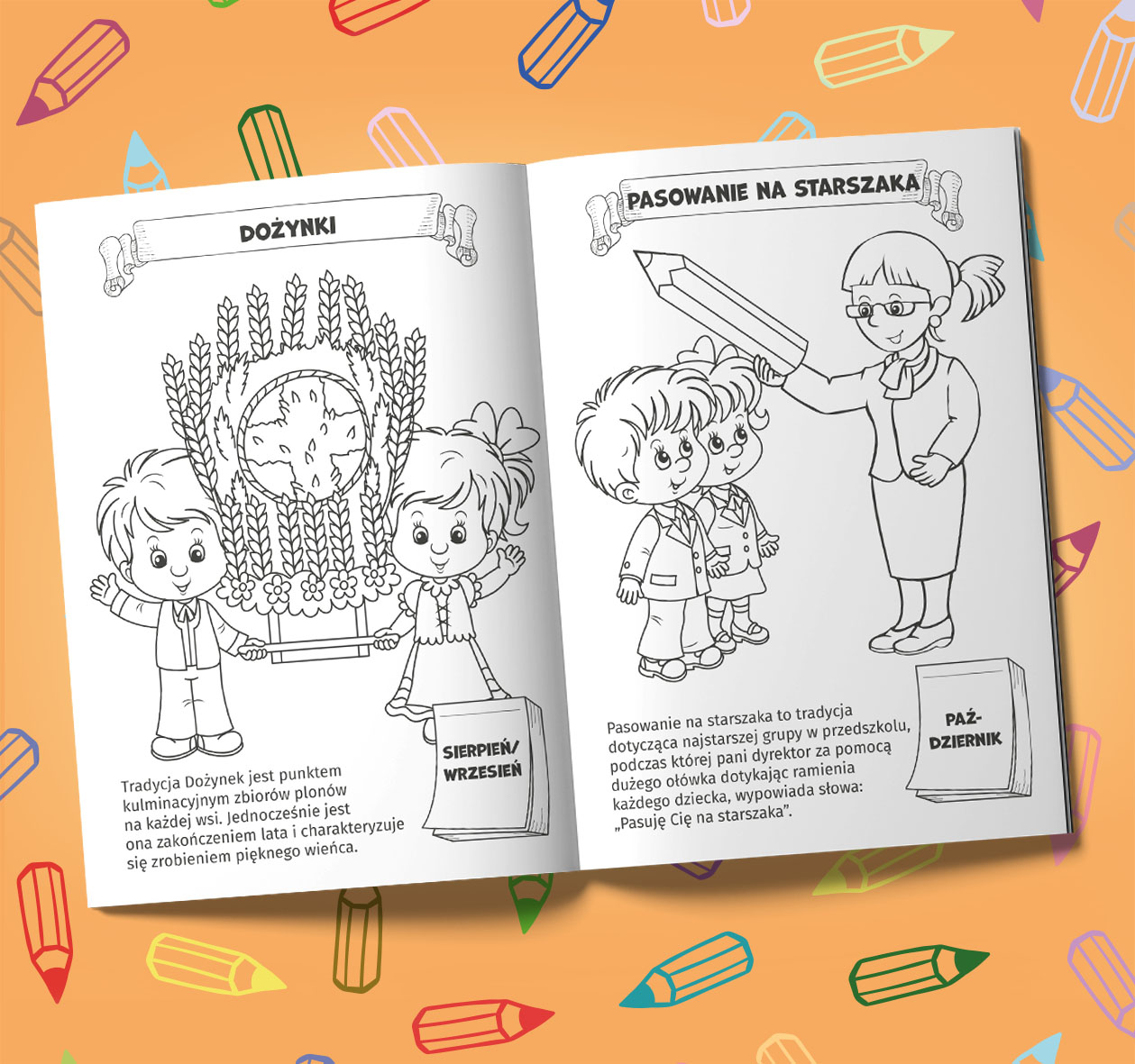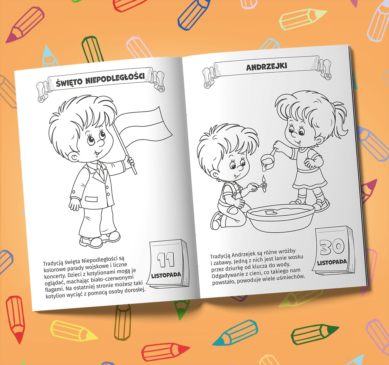 Podczas kolorowania nasze pociechy mają okazję poznać tradycje i zwyczaje występujące w Polsce. Mogą też poznać wiele ciekawostek dotyczących różnych obrzędów związanych z ważnymi wydarzeniami i świętami. W nagrodę za ukończenie kolorowanki dziecko otrzyma kotylion, który może wykorzystać podczas wielu świąt o charakterze państwowym. Kotylion ten jest do wycięcia z okładki przez osobę dorosłą i do wręczenia dziecku.