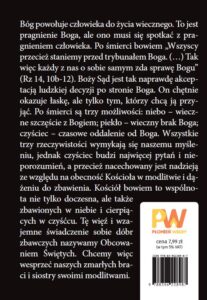 Bóg powołuje człowieka do życia wiecznego. To jest pragnienie Boga, ale ono musi się spotkać z pragnieniem człowieka. Po śmierci bowiem „Wszyscy przecież staniemy przed trybunałem Boga. (…) Tak więc każdy z nas o sobie samym zda sprawę Bogu” (Rz 14, 10b-12). Po śmierci są trzy możliwości: niebo – wieczne szczęście z Bogiem; piekło – wieczny brak Boga; czyściec – czasowe oddalenie od Boga. Wszystkie trzy rzeczywistości wymykają się naszemu myśleniu, jednak czyściec budzi najwięcej pytań i nieporozumień, a przecież nacechowany jest nadzieję ze względu na obecność Kościoła w modlitwie i dążeniu do zbawienia. Kościół bowiem to wspólnota nie tylko doczesna, ale także zbawionych w niebie i cierpiących w czyśćcu. Tę więź i wzajemne świadczenie sobie dóbr zbawczych nazywamy Obcowaniem Świętych. Chcemy więc wesprzeć naszych zmarłych braci i siostry swoimi modlitwami.