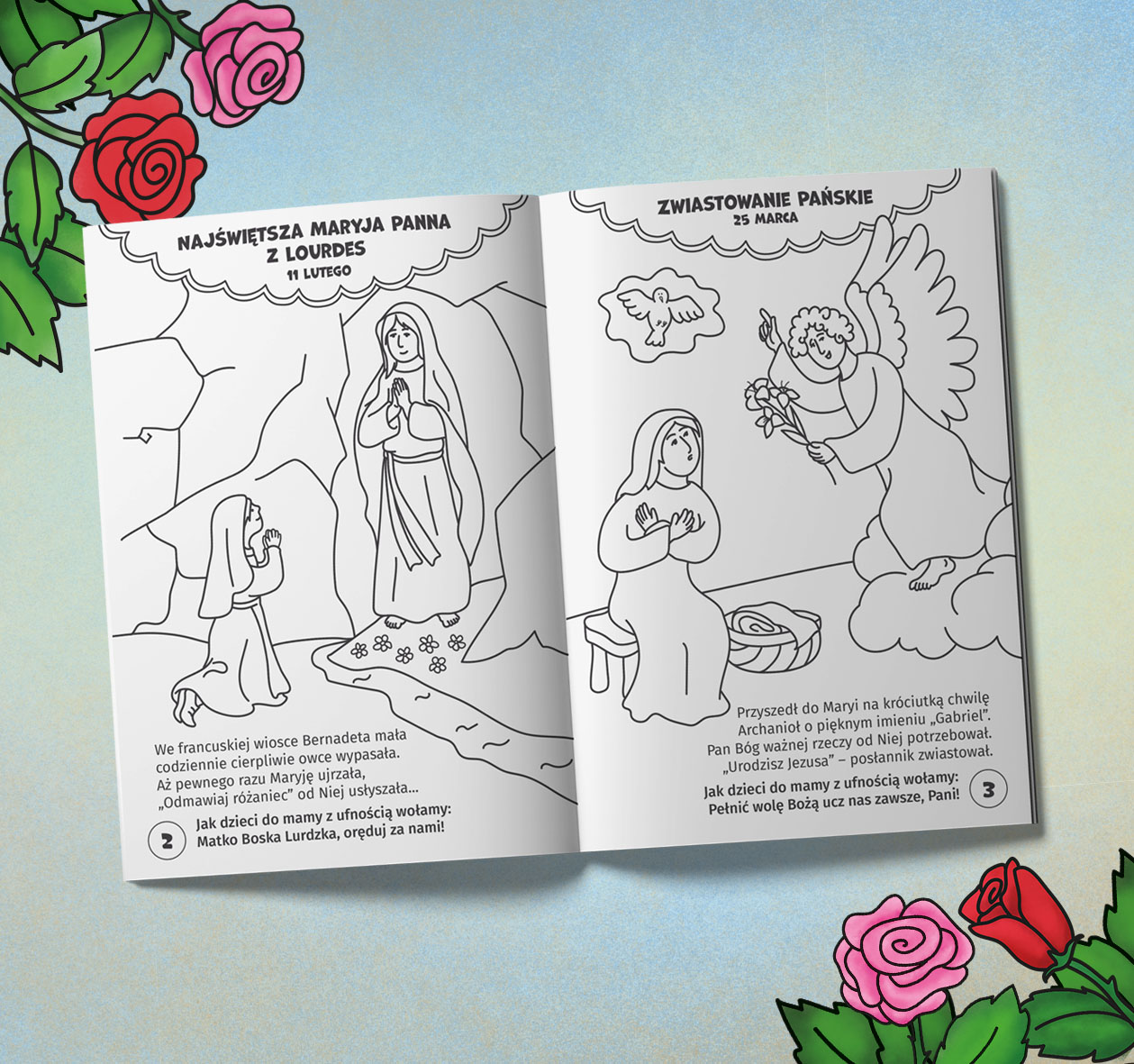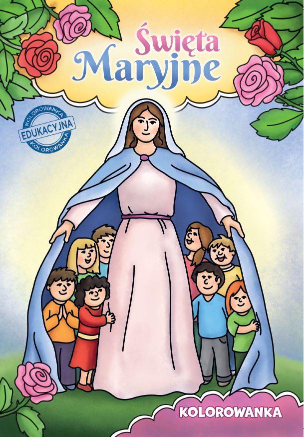 Kolorowanka „Święta Maryjne” uczy najmłodszych katolików jak bardzo kocha ich Matka Najświętsza, matka Pana Jezusa. Wiele razy w ciągu roku liturgicznego są w Kościele przypominane wydarzenie z Jej życia ziemskiego i licznych objawień, w których prosi o modlitwę, zwłaszcza różańcową. Trudno było przedstawić wszystkie uroczystości, święta i wspomnienia maryjne występujące w kalendarzu Kościoła powszechnego. Wybraliśmy zatem te najpopularniejsze, aby dzieci już od najmłodszych lat wzrastały w klimacie wiary i ufności jakie ma Maryja względem Boga.