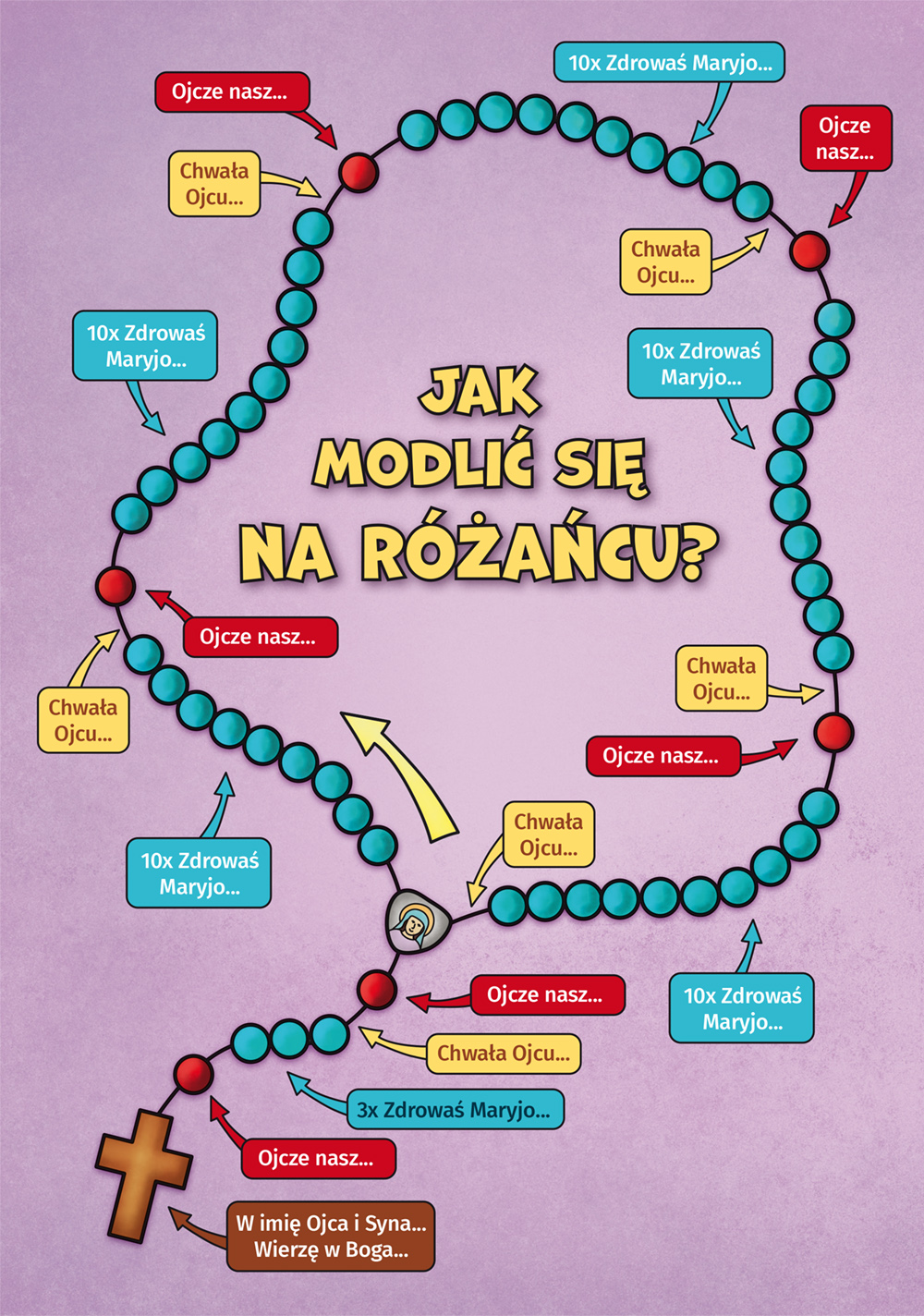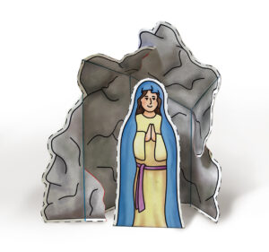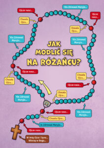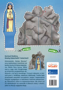 Kolorowanka zawiera opis jak modlić się na różańcu oraz na ostatniej stronie do wycięcia jest Najświętsza Maryja Panna z Lourdes stojąca przed grotą Massabielską (Massabielle).